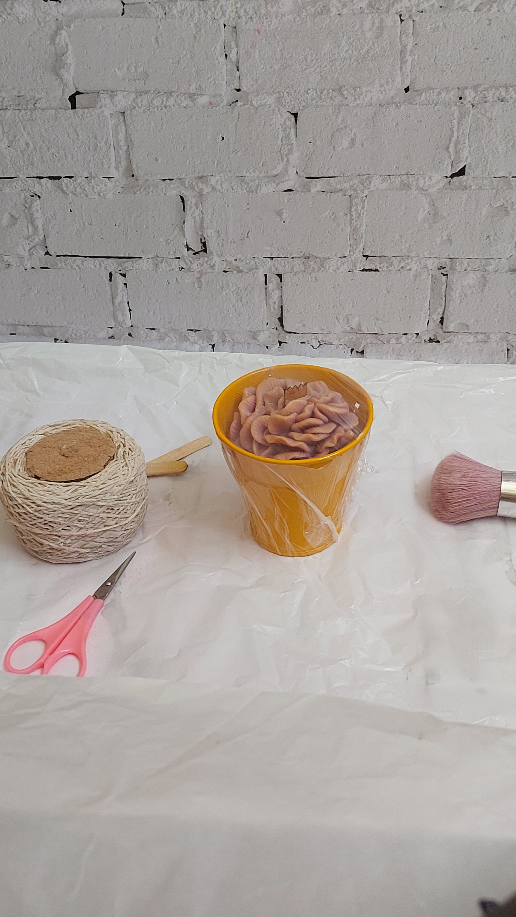 شمع با ظرف(شات) فلزی زرد، طرح گل داوودی بنفش