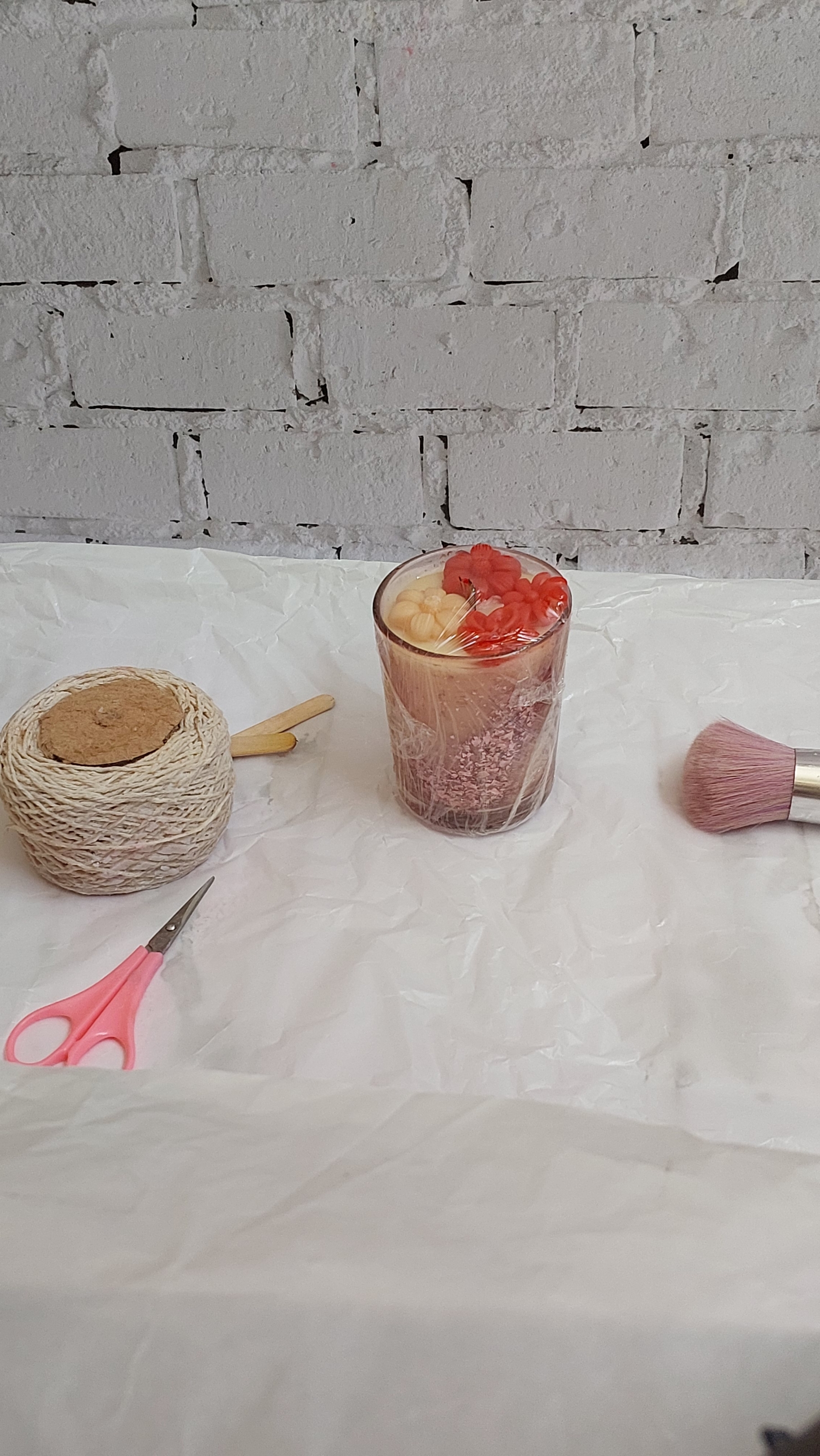 شمع شات شیشهای صورتی ملیح با تزئین گل ریز سفید و قرمز
